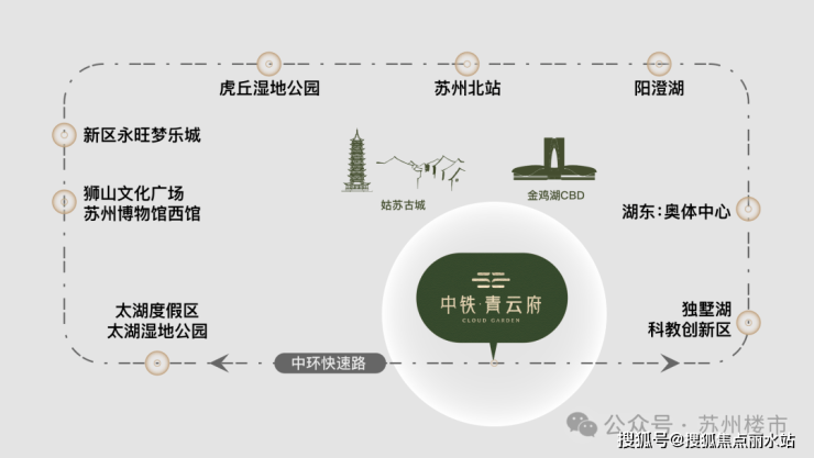 首先它正位“一轴一环”黄金交汇点,从项目出发,一脚油门直上吴东快速路,沿东环高架行驶,转瞬直达姑苏主城;如果前往园区,再一路经现代大道抵达湖东地标,或者转星港街,快速切入金鸡湖CBD;向西出行,通过友新快速路便可顺畅融入狮山。无论去到苏州哪个核心板块,都非常便捷。