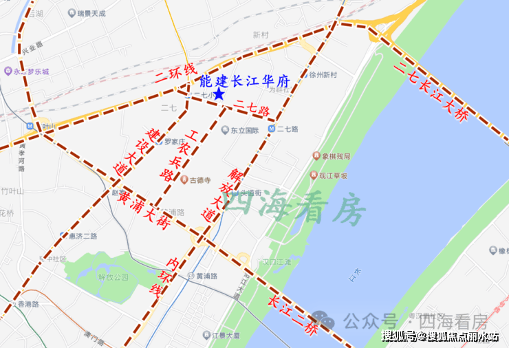 区位:能建长江华府位于二七路与工农兵路交汇处以北,在楼市划分中属于汉口核心二七板块,行政划分属于江岸区,距离内环线1.7公里,距离二环线250米,属于二环以内。