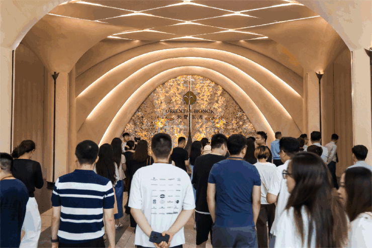 大门与光厅到会所的过渡空间,是天熠东方营造的第二个情绪价值空间——艺廊。