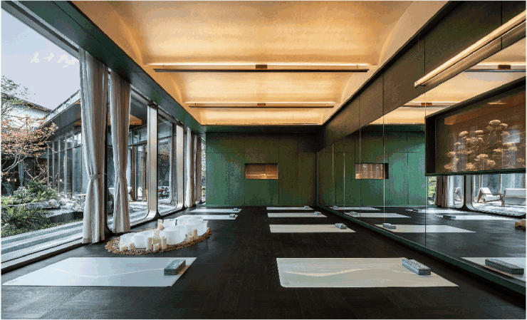 会所配置了女王空间、茶室、健身、瑜伽、恒温泳池等功能,功能就先拉满了。并把原本孤立的会所化整为零,以艺廊串联,其间穿插水景、亭台等景观手法。