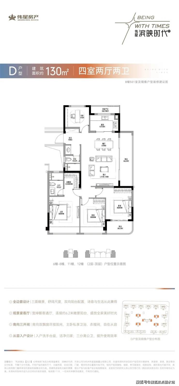 想改善一步到位的购房者还有建面约130方4房:最大的建面约130㎡则是舒适四房格局,这个户型最大的亮点在于双阳台,除了侧边横厅连接一个建面约9㎡的阳台,南面的次卧还连接着一个小阳台。