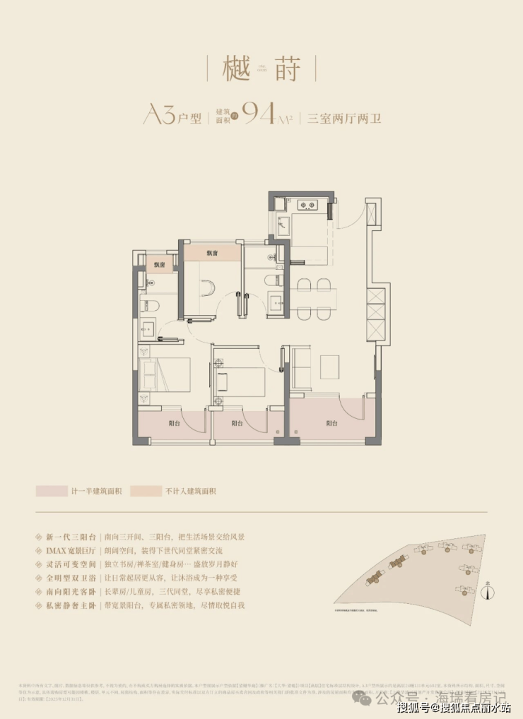 建面约106㎡的三房两厅两卫,3.5开间朝南,南向面宽达到约11.8m!碾压市面上以前的三开间朝南、10米面宽的三房户型。