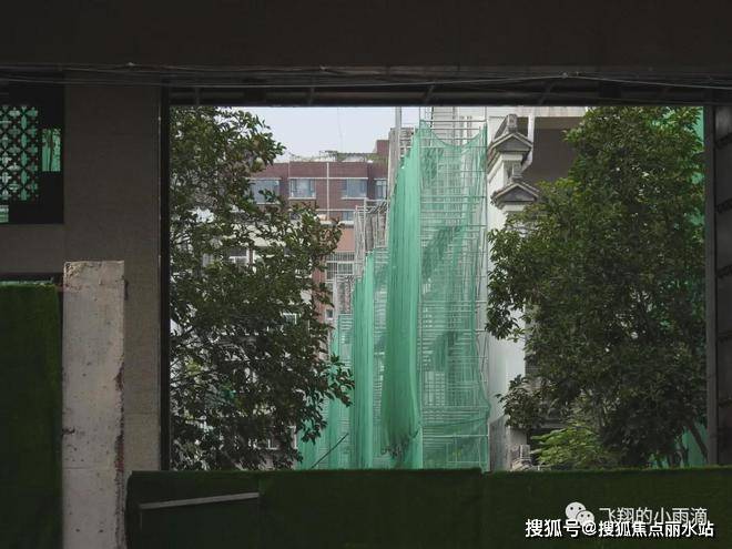 现在里面搭起了脚手架,并且门口也安装了旋转门和有人安保人员,也偶尔能从门口看见带着安全帽的工人。