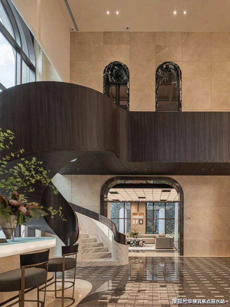 比如,在约12米层高的“月咏”人文艺术厅里,搭配旋转楼梯的日月图书馆体量宏大,不仅收藏了5000余本各类图书,还规划藏书区,阅读区、休闲区等,打造业主专属的书香殿堂。