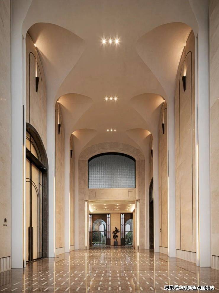 约11.6米高的阵列拱券石材基座奠定厚重基调,9层仿石铝板折面雕琢出宛如运河漪澜的水波纹路,古铜色金属线条与通透玻璃组成虚实和谐的金边玉幕。而270度弧形玉幕窗的设计,更是将建筑从“封闭盒子”转化为“动态取景框”,让运河波光与城市天际线成为家中的天然布景。