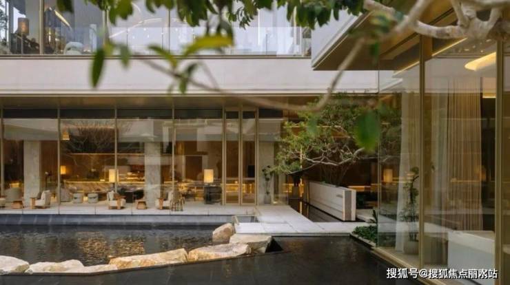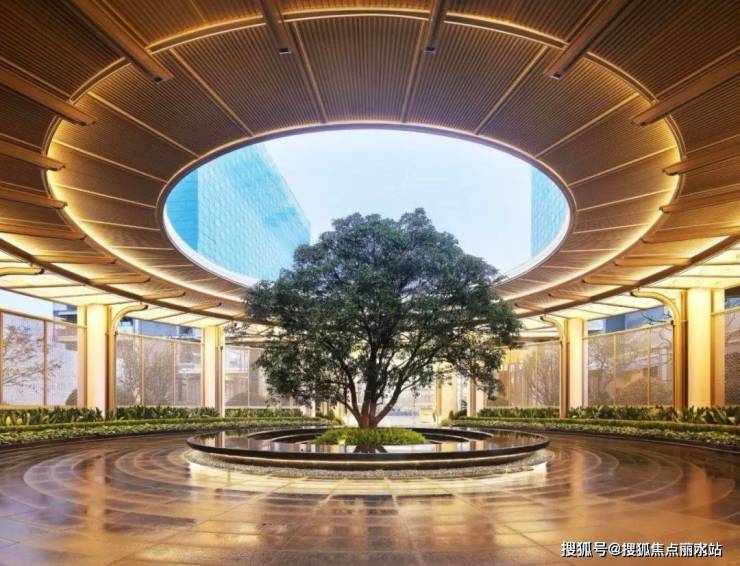 下沉式庭院作为和萃揽悦园的关键归家场景之一,搭配波光粼粼的镜面水景和松柏点缀,有一种“明月松间照,清泉石上流”的人文意境了。