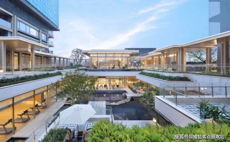 归家动线以环绕下沉式庭院布置。漫步在连廊之上,以水为引再铺陈精选的绿植,随手一拍,松弛气场油然而生。