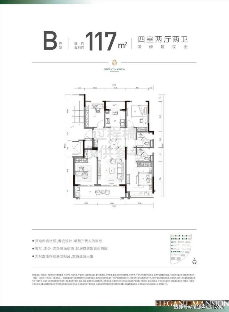 户型设计也比较合理。117平米做成了四房两卫,三开间朝南+南向双开间阳台,适合多孩家庭或需要父母同住的家庭。所有户型都做到了南北通透,客厅和次卧连接阳台,阳台面宽较大。