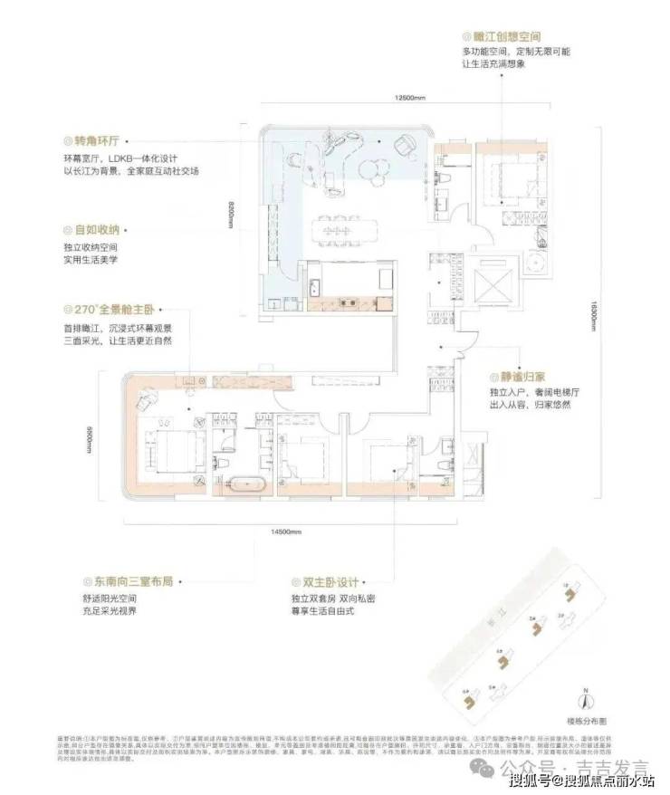 户型:4房2厅3卫,独立入户前室,客厅两面采用大面积玻璃幕墙,约40平转角环幕宽厅。
