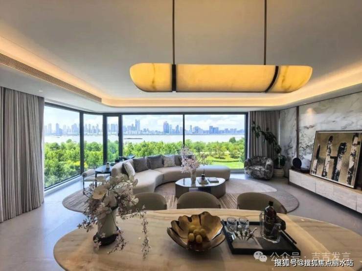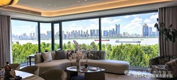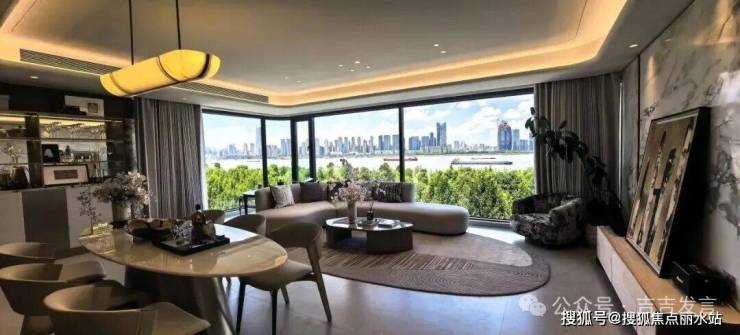 全景无立柱设计,让江景从地面一直延伸到了天花板,而且可以根据需求调整沙发朝向!