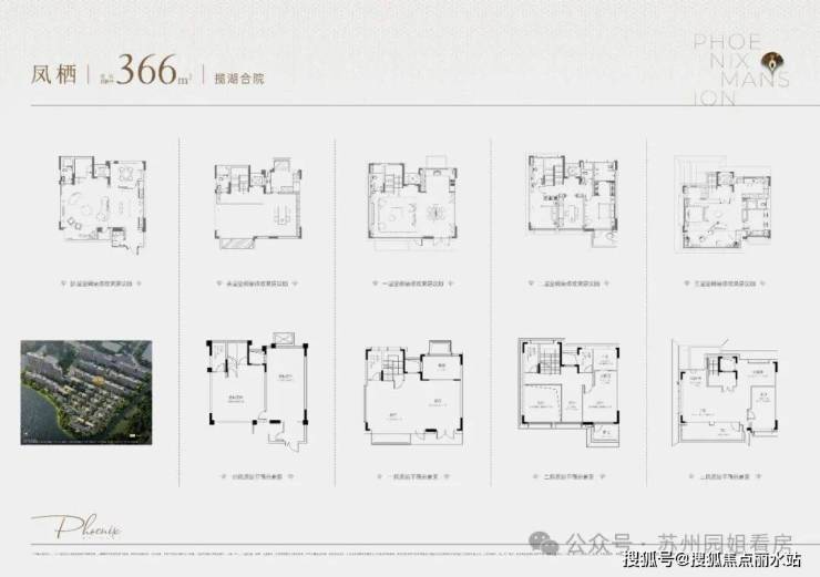 合院主力户型约366/440㎡,横向披檐+层层露台,首层360°洄游厅堂,高窗墙比。