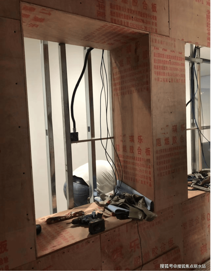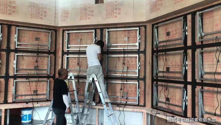 影领科技通过制作结构框架,搭配拼接屏为国茂府营销展厅洽谈区背景区域实现三折幕效果。