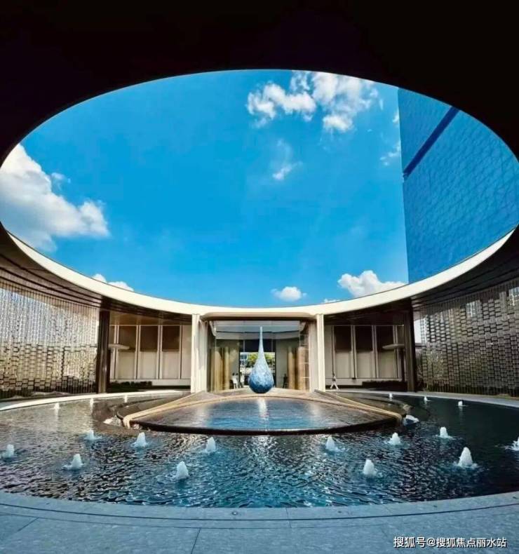 二进弧光织境,讲究“天圆地方”、“四水归堂”,中心水滴造型雕塑,形如宝瓶美轮美奂。