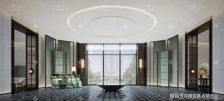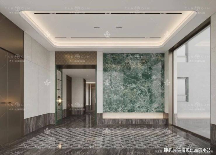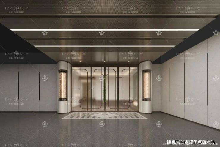 高约9m、宽约30m的阔尺门庭,是业主归家的第一道风景线,高门大户,先声夺人,将归家的仪式感拉满。两扇大门拼成一个“珺”字,寓意君子如玉,温润而泽。门前地面方胜纹石材拼花铺装,是典型海派装饰主义的风格,将生活的丰盛渲染得淋漓尽致。