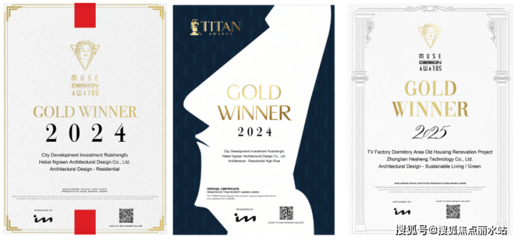 凭借卓越设计与品质,项目先后斩获“2024缪斯设计奖金奖”“2025缪斯设计奖金奖”“2024年美国TITAN地产奖—高层居住建筑类别金奖”等国际荣誉,品质获全球权威认可。