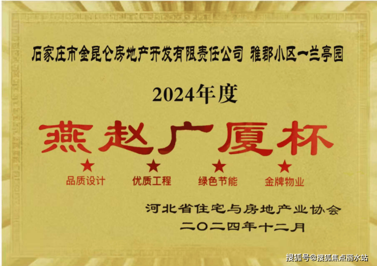 雅郡—兰亭园凭借在规划设计、工程质量、绿色节能、物业管理等方面的卓越表现,荣获2024年度“燕赵广厦杯”大奖,是对其高品质建筑项目的高度认可。