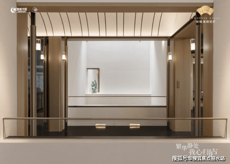 上图是凤栖云庐的入户界面,一眼看过去,与当前市场楼盘入户门头常见的豪奢风截然不同,凤栖云庐营造的是一种“隐匿于繁华中”的高奢酒店入户体验: