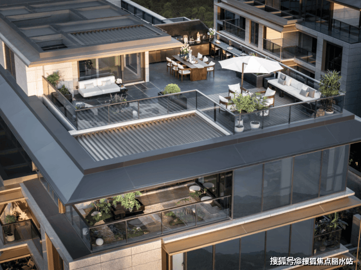 再看合院产品,大量运用了“木纹转印铝格栅”,将水平露台与竖向视线管理构件结合,温暖自然而又不失辨识度。更为关键的,这从根源上杜绝了传统低密产品常见的杂乱的“视觉污染”问题,同时有效解决了隐私保护与视线平权方面存在的难题。