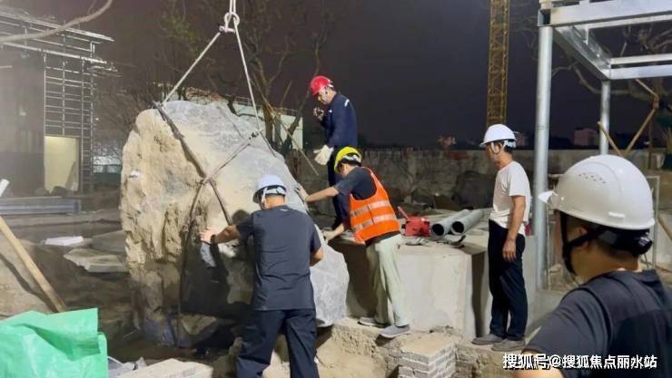 石材取自一块重达30余吨的完整原石“福鼎黑”,经一天一夜精心切割而成,安装动用500吨吊机,耗时数小时,方精准就位,这对石材规格与施工工艺皆是考验。过程中为求极致效果,石桥还被重新顶起,两侧整体下调十余公分,尽管这一动,牵动周边树木、景观布局也因此调整,但收获的却是浑然天成的闲趣意蕴。