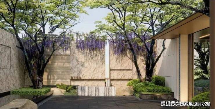 为呈现自然灵动的天成之美,设计往返于多个石场,选择了呈现“苍劲斑驳”纹路的古朴肌理石材,以示“根基稳固,聚财生旺”的美好寓意,与周边植物融合成景后,典雅稳重的东方美学意境扑面而来,静默中自有天地。