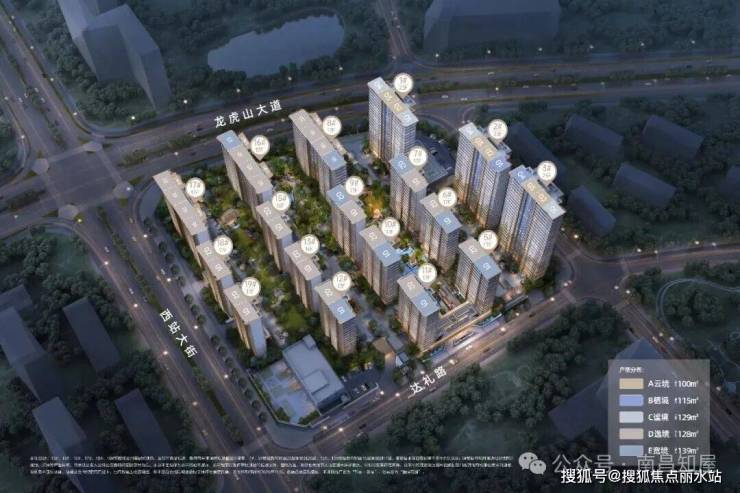项目整体规划为 17 栋住宅,其中 3 栋为 23 至 26 层的高层,其余 14 栋为 16 至 17 层的小高层。小区东侧设有一处近 40 米宽的主入口大门,向内延伸有 3 个下沉庭院,其中一个为水系庭院,下沉庭院西侧、地块偏中央位置设有中央水景,形成东西向景观轴。建筑外立面采用公建化设计,南向全部封窗,每栋楼有金色线条装饰,山墙面有灰白色 + 线条装饰和玻璃面两种。