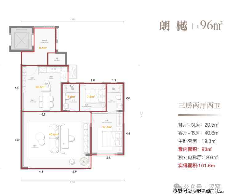 8号楼高层为三梯四户布局,1个单元,主打96平三房两卫、119平四房两卫,共计184套房源,这个跟之前的高层户型、配置是一样的,两个中间户通过贯穿式双开门电梯可以实现专梯入户的效果,也就是说,项目所有户型都能实现专梯入户,以及可利用的专属电梯厅,变相增加了拓展面积