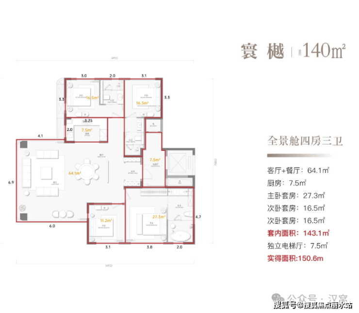 7号楼小高层为两梯两户布局,2个单元,主打140平米四房三卫(全景舱+方厅设计),与一期产品一样,区别在于二期7号楼另有8套城市平墅,算是一个新品;