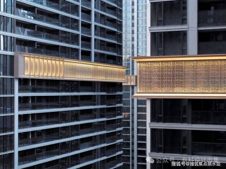 立面设计汲取长江流动水韵的灵感,以风帆造型营造出极具辨识度的塔冠设计。定制的鎏金腰线既以「鎏光织锦」雕琢高定美学立面,更借起伏曲线暗合奔涌江潮之势——将长江「云奔潮涌、勇立潮头」的进取精神,凝练为武汉瑞府的城市精神图腾。