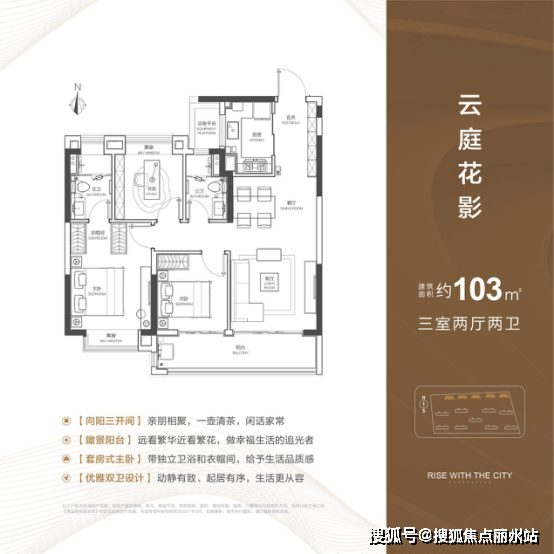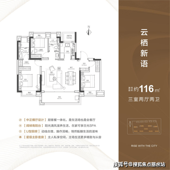 整体来看,116m²亮点颇多。U型厨房,抽拉式水龙头,西门子厨具,洗切烹动线流畅;独立玄关入户,家庭公区收展一体化;北侧全飘窗设计,公卫干湿分离,主卧套间, 宽景阳台面宽约5米8,进深约1米8 。