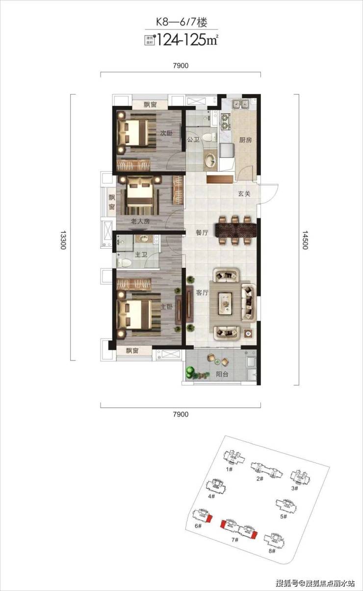 131㎡的户型,3室2厅2卫,6号楼的西边户。124㎡的宽境户型,3室2厅2卫,6号楼的东边户。