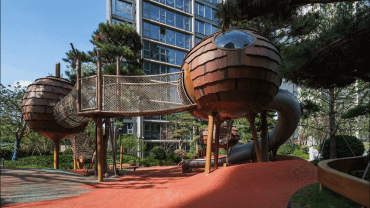 北区约2000㎡的达尔文营地,借助起伏地形打造出自然山谷乐园,松果攀爬架、模拟商店等设施,让孩子们在游戏中认知自然、锤炼勇气。生活在澐璟的孩子们,他们的童年不是面对冰冷的塑料玩具,而是在这片充满生态认知的天地里自由奔跑。