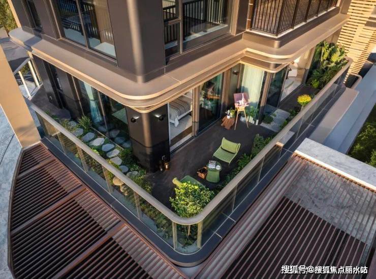 · L型露台——当你身在这个270°环形巨幕庭院,让你恍惚间有种身在双拼别墅庭院的错觉,在客厅、在主卧,眼前都是那片绿意盎然的庭院。只有抬头与宁波中心大厦对望,才把你拉回四代宅。