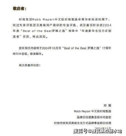 前不久,武汉嘉佰轩荣获2024年度“Best of the Best罗博之选”榜单中“年度豪华生活方式创造者”国际奖项。