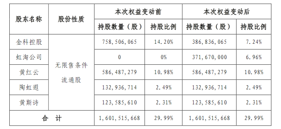 从目前股权来看,作为一致行动人的金科控股、黄红云、陶虹遐、黄斯诗及虹淘公司,总计持股仍为29.99%,并无变化。