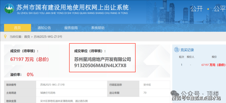 就在今年7月23日,苏地2025-WG-Z13号地块,星河+天鸿伟业成功竞得,楼面价14400元/平,成交总价6.72亿元。