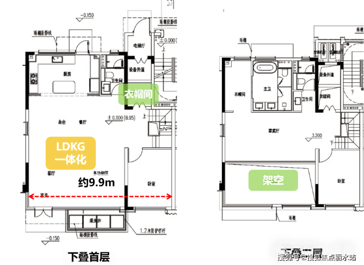 顶楼点评: 下叠面宽约9.9米,一层为前庭后院双入户与LDKG一体化,大横厅是一大亮点;客厅上空是挑空空间,未来可打造为双套房设计。