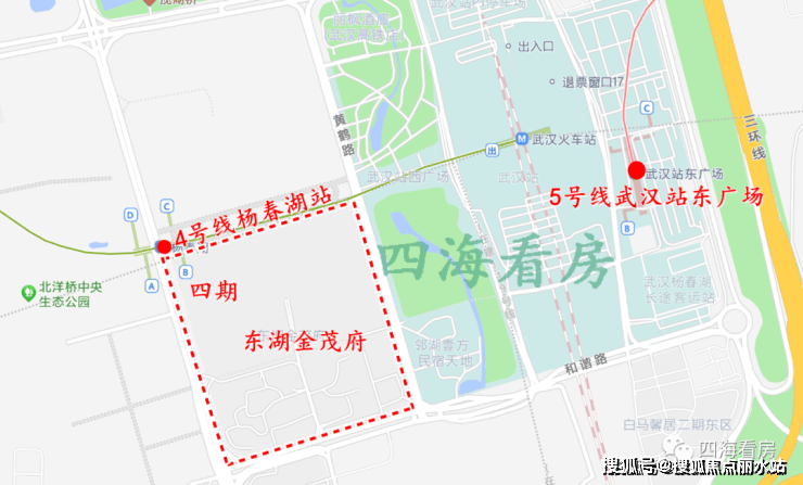 地铁:项目四期楼下就是4号线杨春湖站,是个正地铁口楼盘,距离5号线武汉站东广场站约800多米。