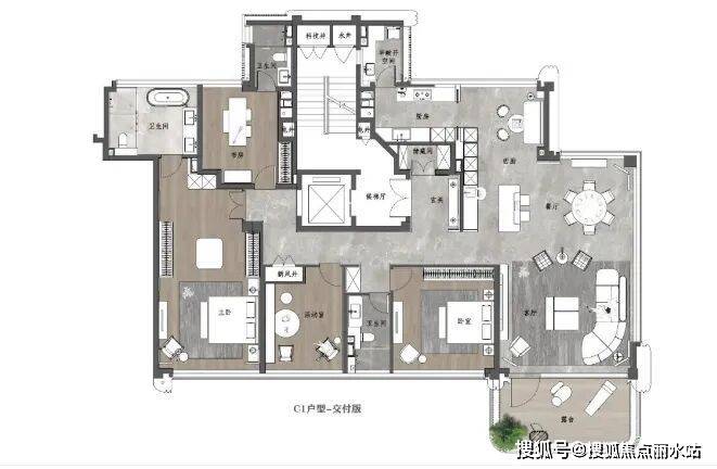 (1)超级洄游动线:独立入户梯厅—入户玄关—餐厅—家政间—厨房—客厅—主卧套房,完美预演女主人从超市买菜归家后的洄游动线。即使走在大平层中,由于动线优化合理,也不会“累觉不爱”。