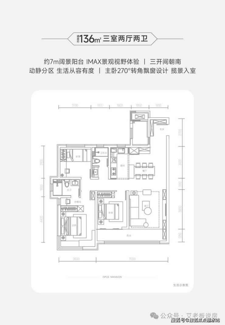 优点:将近7米的落地窗联通阳台,主卧270°的观景阳台,都是户型的亮点。