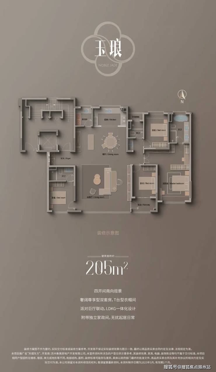 建面约205㎡四房两厅三卫:四开间朝南,整体南向开间约14.9米,采光视野极佳,南向双套房设计进一步提升居住舒适度。