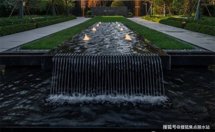 穿过景墙正式进入小区后,抬高式中轴水景跃然眼前!长达约24米,上层8个泉涌,流动起来的层次感配合潺潺流水声,生命的律动感迎面而来。两旁搭配的迎宾树阵(5棵朴树、8棵金桂)进一步增添了仪式感和景观的层次丰富性。在每年有数月酷暑天的武汉,回家进入小区后看到一片精致水景,一丝难得的清凉将涌入心头。