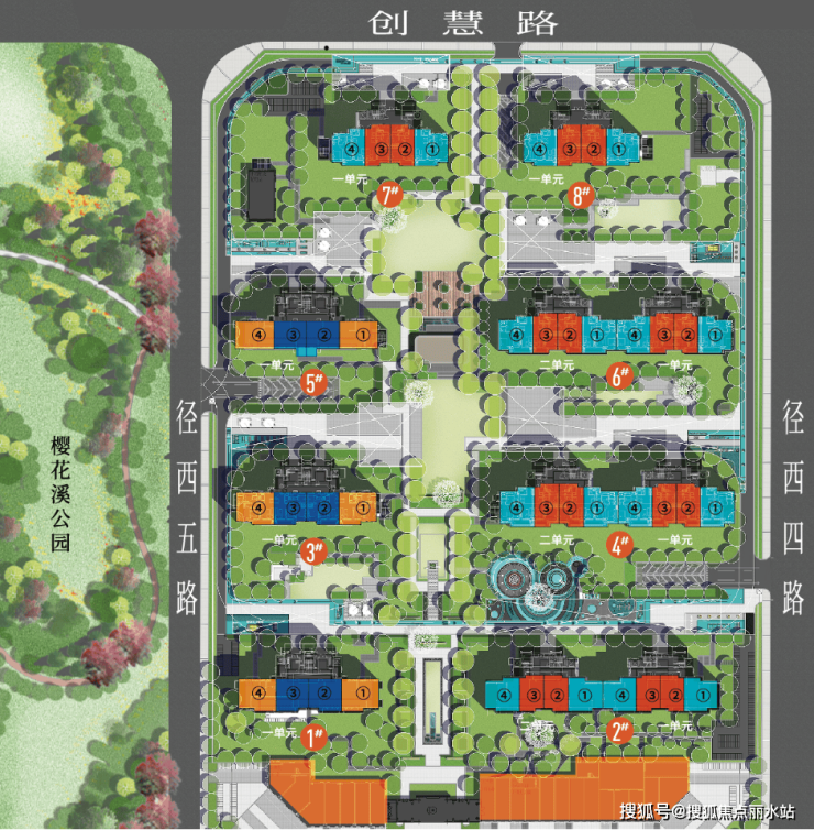 从平面图来看,该项目地块非常的完整方正,且所有楼栋都是正南北朝向,1、2号楼位于小区南侧,南边是小区规划的商业,一路之隔是学校用地,南向视野非常不错,且距离小区主入口更近,进出小区便利,后期到学校、到小区商业都更方便。3号楼位于小区中部,西侧是樱花溪公园,其余三个方位被小区园林景观环绕。