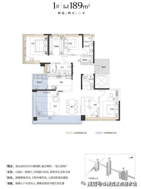首先来看1号楼西侧对着长江的建面约189平看江大户型: