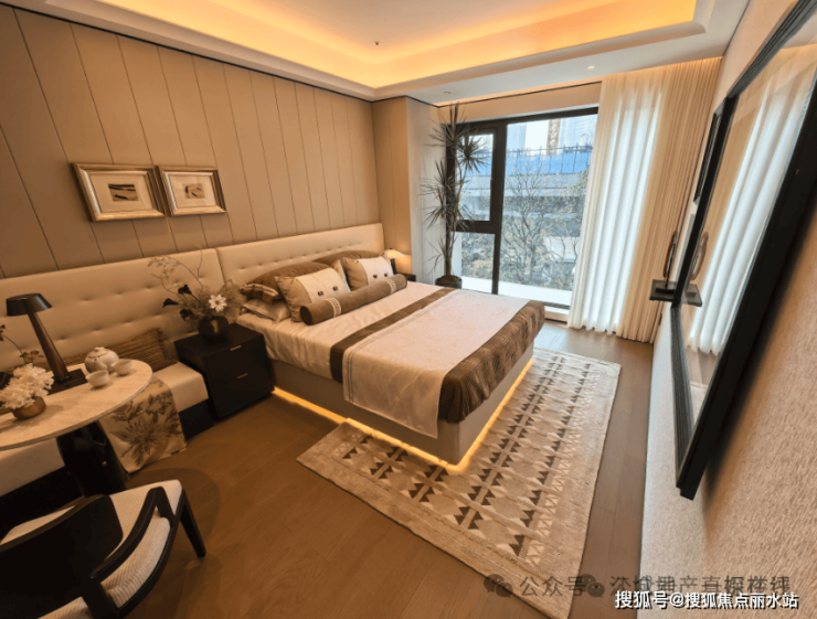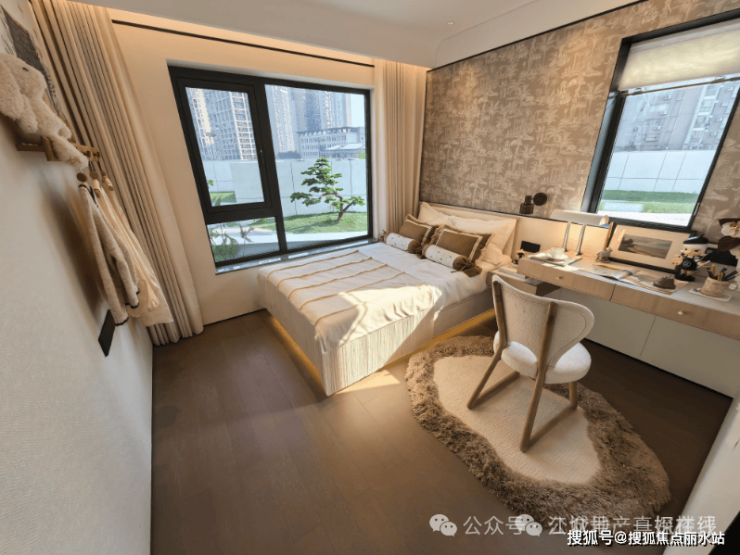 三面采光的主卧,可惜的是不是在高区实体样板间,看不到窗外江景视野。