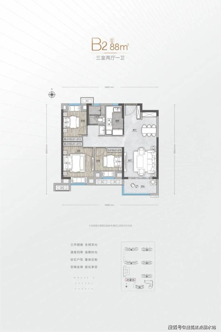 B2户型建面约88平 三房两厅一卫