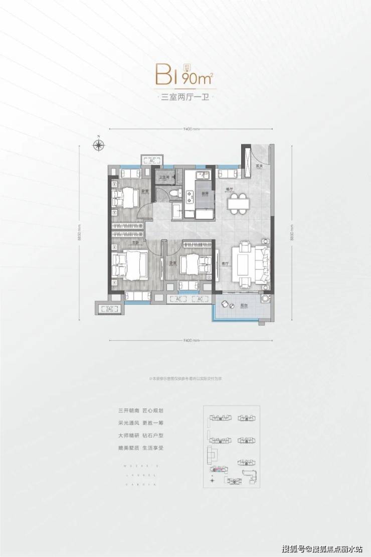 B1户型建面约90平 三房两厅一卫
