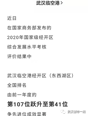 东西湖区这两年发展非常迅猛,从近期东西湖区官方微信公众号发布的内容来看,东西湖区在全国的所有国家级经济技术开发区排名中一年跃升66位,从107位上升至41位。