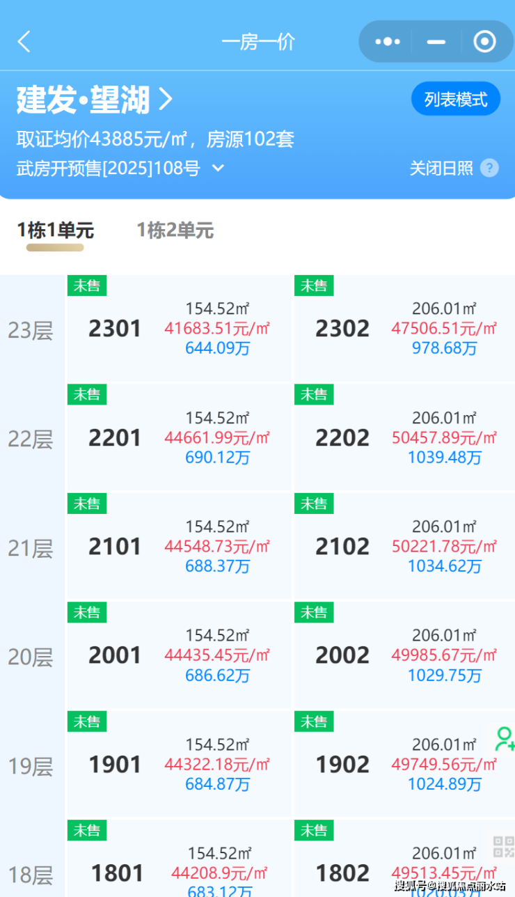 1号楼包含2个单元,1单元总高23层,2单元总高30层,同楼层价格来说,以同样的155平户型为例,1单元20层1号房155平户型备案单价44435元/平,总价686万,2单元2号房155平户型备案单价43082元/平,总价666万,有20万总价的区别。