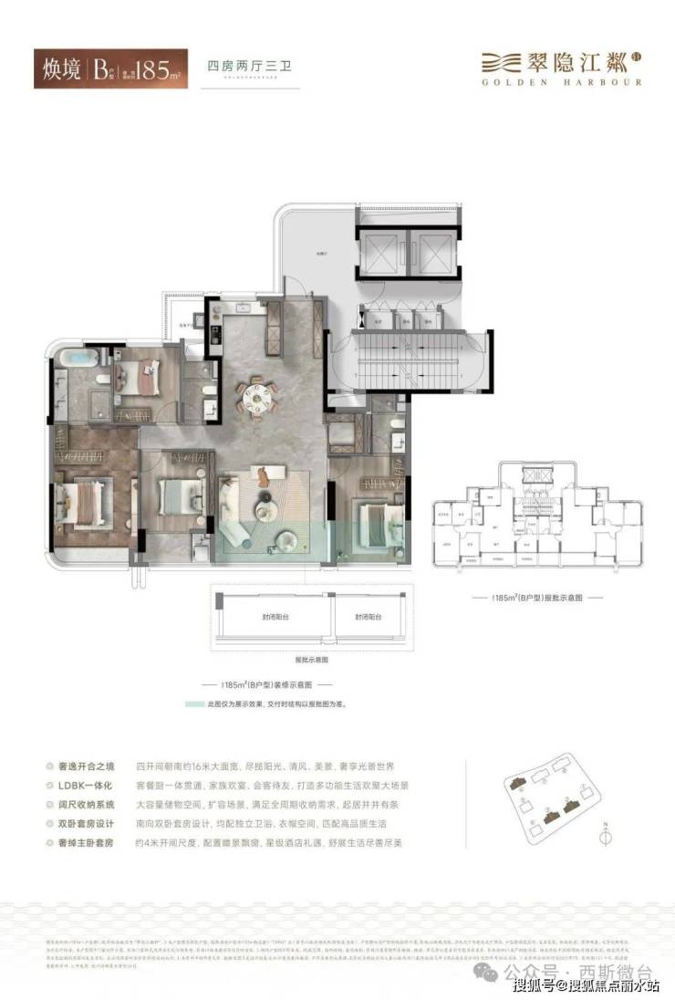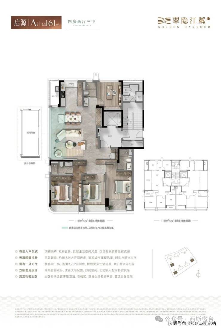 其中,161方共计96套,占比34.5%,做4房3卫户型;185方共计110套,占比39.6%,做4房3卫户型;230方共计72套,占比25.9%,做5房3卫户型。