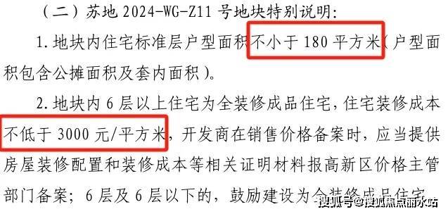 地块出让信息显示,地块内住宅标准层户型面积不小于180平方米,地块内6层以上住宅为全装修成品住宅,住宅装修成本不低于3000元/平;6层及6层以下的,鼓励建设为全装修成品住宅。售楼处电话400-8787-098接通后输入5678【营销中心】